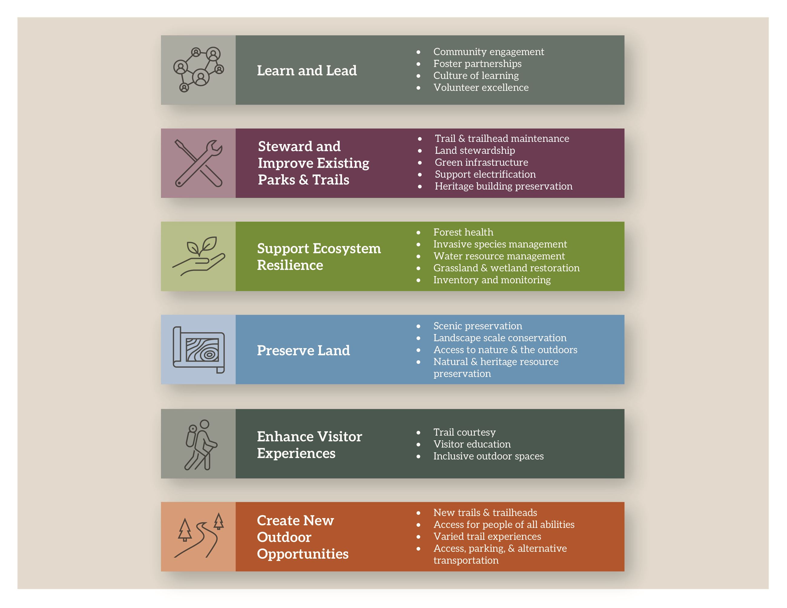 “Steward and Improve Existing Parks and Trails:” Caring for and improving existing parks and trails, including green infrastructure and preserving historic buildings.